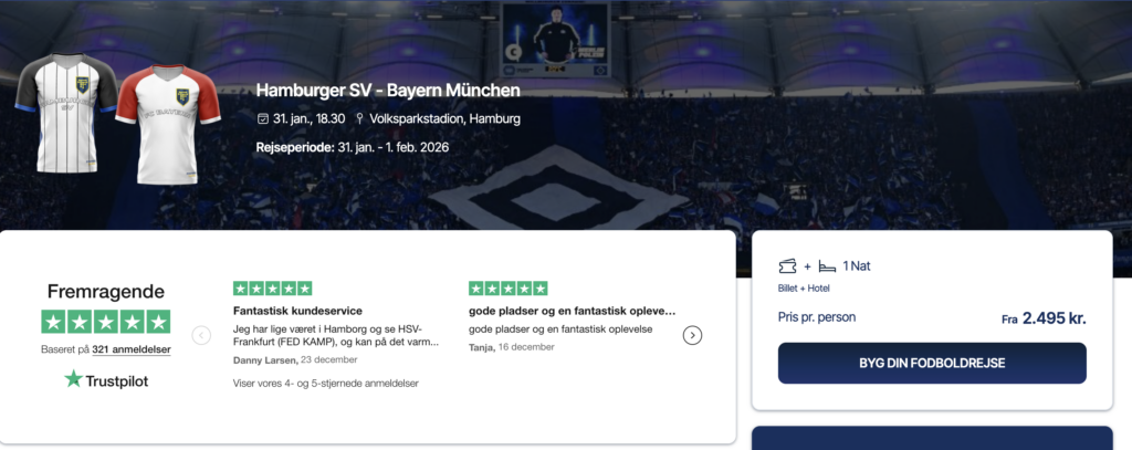 Lige nu kan du eksempelvis komme ned og se HSV møder Bayern på Volksparkstadion i slutningen af januar. Du får en kampbillet og en enkelt nat på hotel for 2.495 DKK. Og derudover får du altså fem procents rabat, hvis du benytter vores rabatkode.