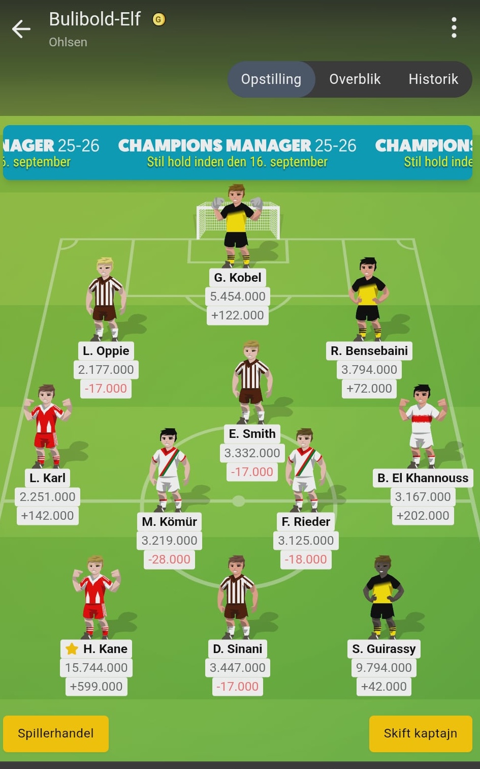 Det bliver blot til en enkelt udskiftning denne gang. Den kræver dog et formationsskifte fra 4-3-3 til 3-4-3. Anselmino kan bare ikke blive sin skade kvit, og så må han naturligvis ud. Jeg satser i stedet på Stuttgarts nye 10´er. Den fra Leicester udlejede marokkaner scorede senest i sejren mod St. Pauli og med Stuttgarts gode program in mente, så kan det sagtens blive til flere scoringer for Bilal El Khannouss.